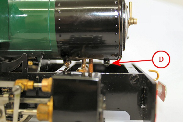 Once the front foot plate has been removed, you will see the front smoke box clamp screw under the front of the smoke box wrapper ('D' in FIG 3). Slacken, but do not remove,this clamp screw.