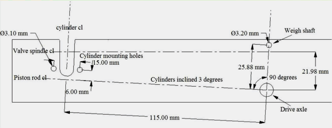 The valve gear can be anything you care to make, or, if building valve gears is not your thing, the Roundhouse Walschaerts valve gear is detailed further down this page. Full valve travel is .140" ( 3.56mm).