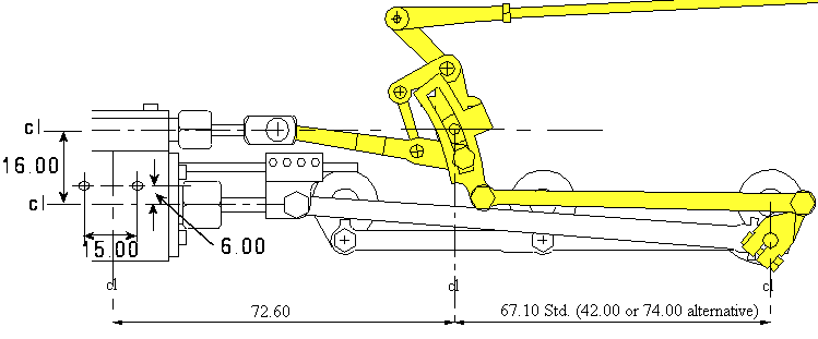 General arrangement of valve gear - coupling, connecting rods and outside cranks shown for referance only but are not included in the valve gear set. All dimensions in millimetres.